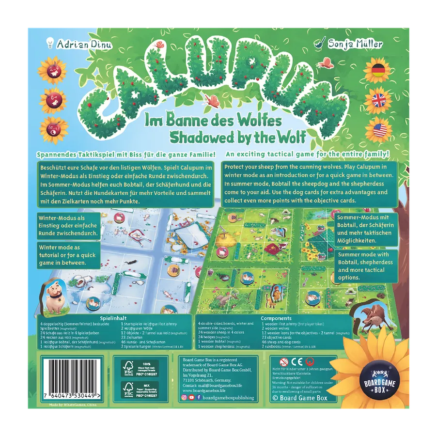Beschützt eure Schafe vor den listigen Wölfen. Spielt Calupum im Winter-Modus als Einstieg oder einfache Runde zwischendurch. Im Sommer-Modus helfen euch Bobtail, der Schäferhund und die Schäferin. Nutzt die Hundekarten für mehr Vorteile und sammelt mit den Zielkarten noch mehr Punkte.